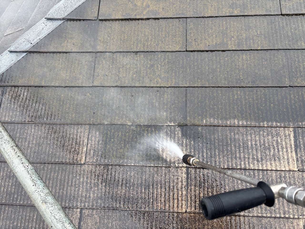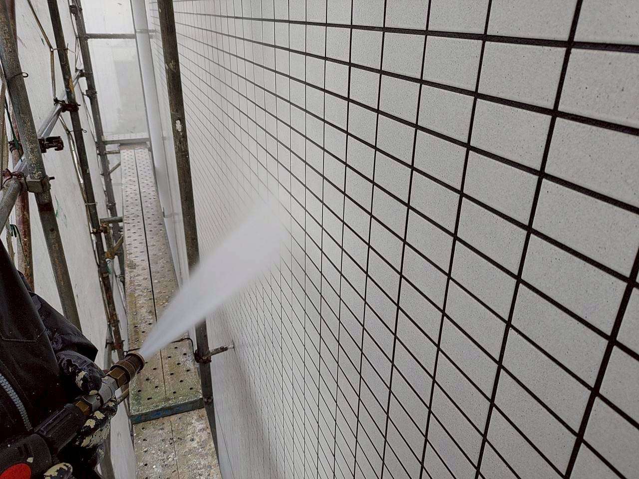 高圧洗浄はその特性上、吹き出す水がどうやっても飛散します。そして高所での洗浄はより遠くまで水が飛散しますので施工は雨天の時が望ましいです。